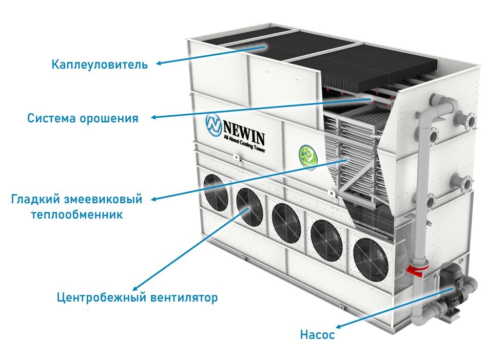 Охлаждающая вода подается в систему орошения с помощью циркуляционного насоса. Градирня может быть оснащена специальными глушителями, значительно снижающих уровень шума.