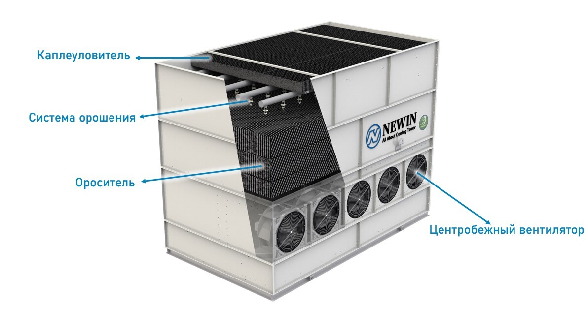 В результате контакта с воздухом, который в данном типе градирни движется навстречу потоку воды, вода испаряется, охлаждается и попадает в поддон, откуда подается обратно потребителю.