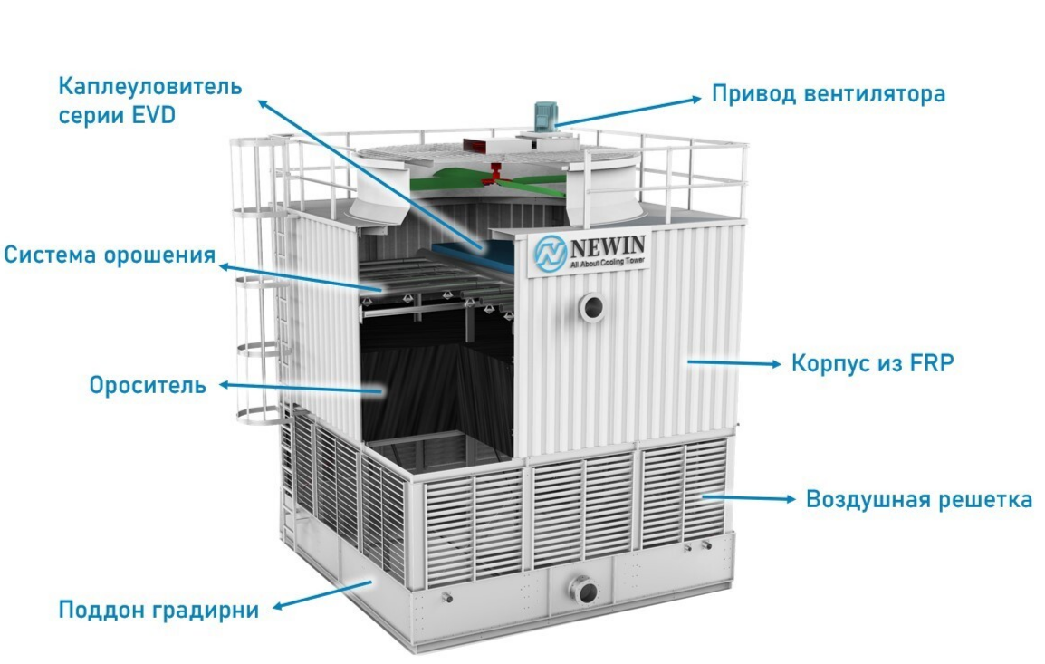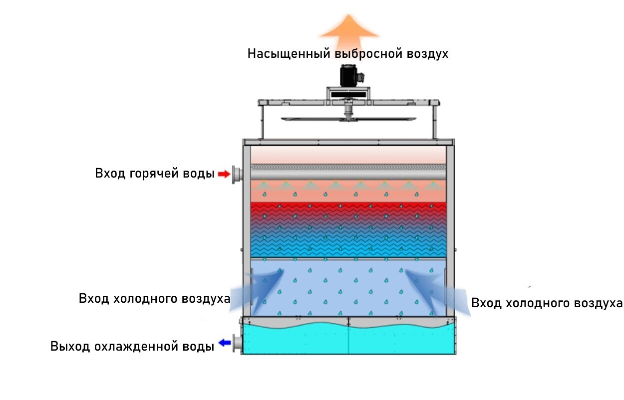 В результате контакта с воздухом, который в данном типе градирни движется навстречу потоку воды, вода испаряется, охлаждается и попадает в поддон, откуда подается обратно потребителю.
